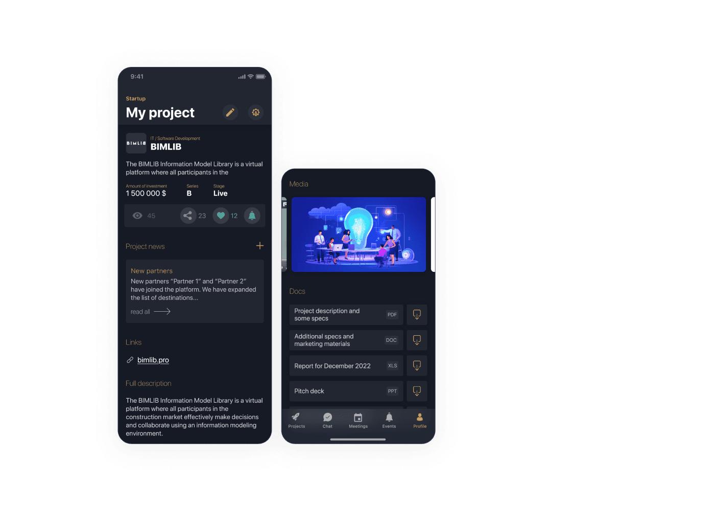 This project involves a mobile application designed for investors and startups within our holding group. After internal testing, we're looking to extend it to public projects. The goal is to create a practical platform, straightforward and effective for investors to track projects, startups to present initiatives, and administrators to manage communication and meetings in the realm of investment projects.
